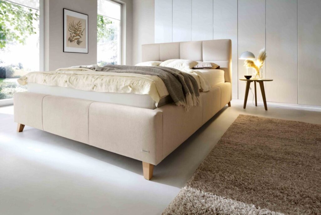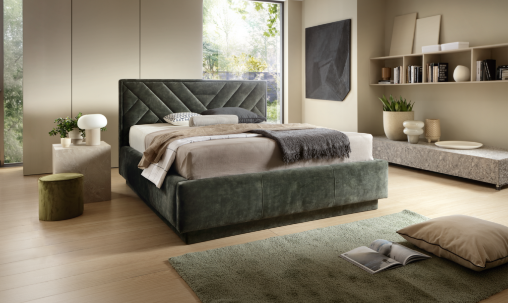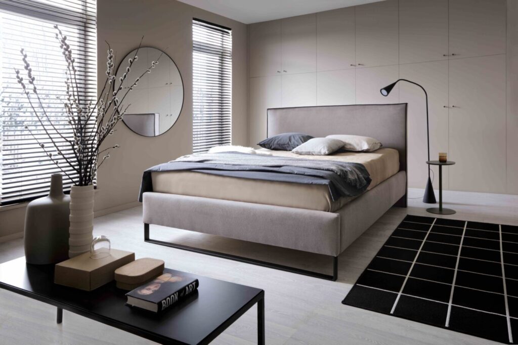 Łóżko do współczesnej sypialni – w formie świadomie lapidarne, w funkcji niezawodnie wygodne. Prosta skrzynia (podstawa materaca) tapicerowana jest jednolicie z wezgłowiem, które ożywiono starannym pikowaniem.