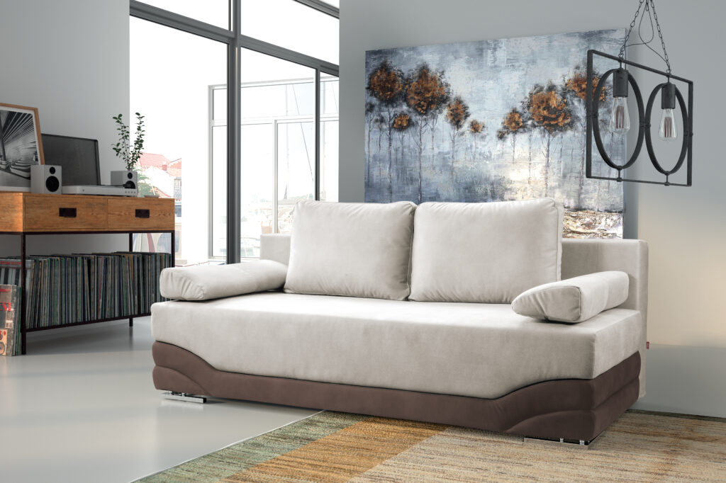 Sofa ze spaniem na materacu "stelaż włoski" z pojemnikami w bokach.