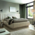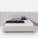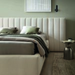 Jednym z najbardziej charakterystycznych elementów modelu Cortez jest jego zagłówek. Ozdobiony głębokimi, pionowymi przeszyciami, dodaje sypialni nie tylko stylu, ale również optycznej wysokości. Zagłówek występuje w dwóch opcjach. Podstawowa wersja jest szerokości podstawy łóżka, co sprawia, że krawędzie idealnie współgrają z bokami. Dodatkowo istnieje możliwość poszerzenia go o 60 cm z każdej strony za pomocą specjalnych dostawek, utrzymanych w tym samym zdobieniu. Cortez wyróżnia się również nietypową podstawą. Oprócz tapicerowanej ramy zastosowano dodatkową obudowę, również pokrytą tą samą tkaniną. Zrezygnowano z tradycyjnych nóżek na rzecz tzw. „ślizgów”, sprawiając, że podstawa jest równa z podłogą, co wpisuje się w panujące trendy wnętrzarskie. To nie tylko estetyczne, lecz także praktyczne rozwiązanie, ułatwiające utrzymanie czystości w sypialni, eliminując gromadzenie kurzu pod łóżkiem.